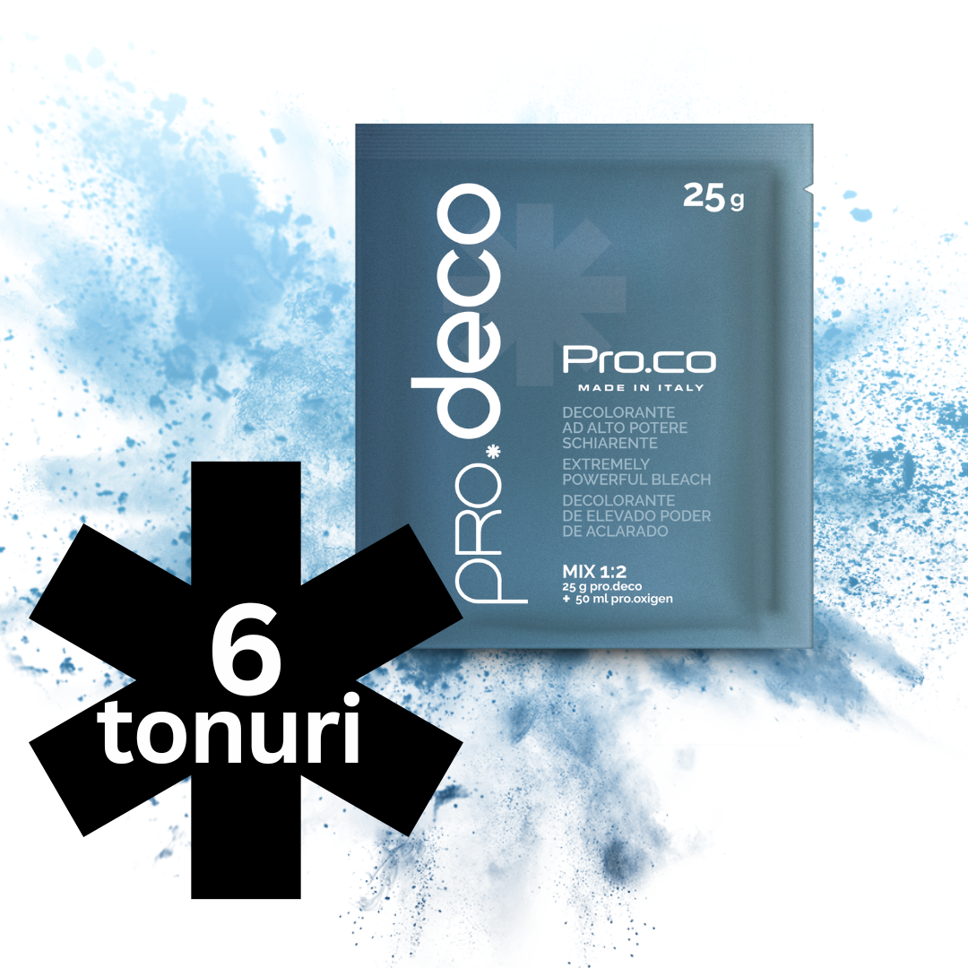 Decolorantul PRO.DECO6 este un produs profesional și se poate utiliza pe părul natural sau extensii.